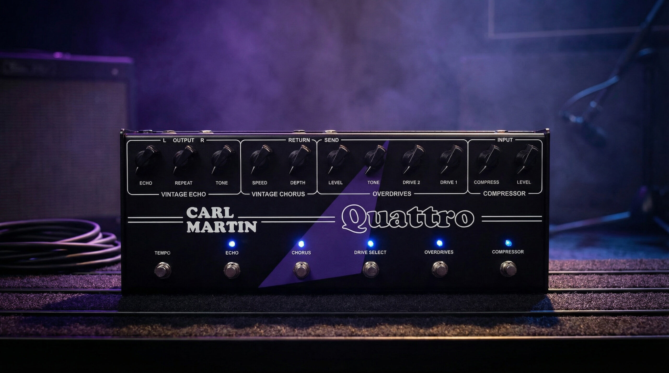 When we designed Quattro, the goal was straightforward: bring four of our most used, performance-ready effects together in one unit — without losing feel, headroom, or clarity. Instead of digital modeling or layered menus, we focused on real circuits, immediate control, and a signal path that behaves like a proper pedalboard.